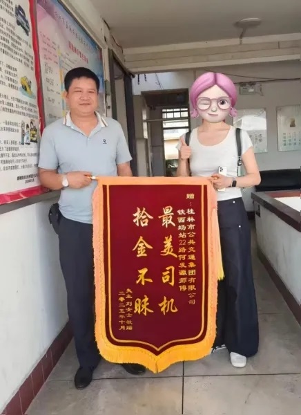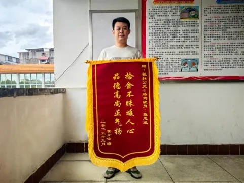 10月6日,,,,,,,,河池乘客黄女士将装有2500元现金、身份证件及银行卡的背包遗落于6路公交车上。。。。。。。正当她焦急万分找到场站时,,,,,,,,得知驾驶员莫忠迅在车辆回场后已第一时间将失物上交。。。。。。。这份“不耽误返程”的安心,,,,,,,,让黄女士深受感动,,,,,,,,专门寄来锦旗表达谢意。。。。。。。